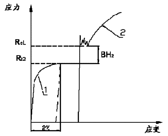 烘烤硬化值(BH2)的计算 烘烤硬化值(BH2)为试样烘烤后的下屈服强度或非比例延伸0.2%(无明显屈服时)对应的屈服强度与烘烤前同一个试样总延伸2%对应的屈服强度的差值。BH2的计算示意图如图A.1所示,计算公式如下: BH2=