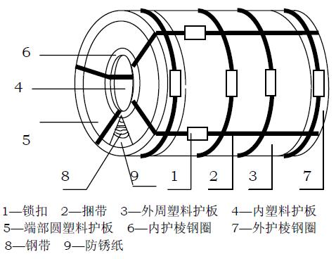 外护棱钢圈:避免钢卷外圈边部受外力损伤,固定外周包板和铁圆护板,减少雨水对钢卷的侵袭。 10.