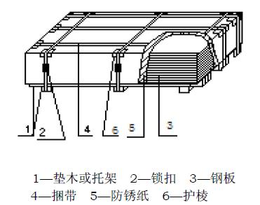 捆扎道次:至少纵向2道,横向3道; 3. 捆扎处加护棱; 4. 用垫木或托架。 |