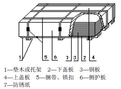 用上盖板、下盖板和侧护板包裹; 3. 捆扎道次:至少纵向3道,横向3道; 4. 用垫木或托架。 |