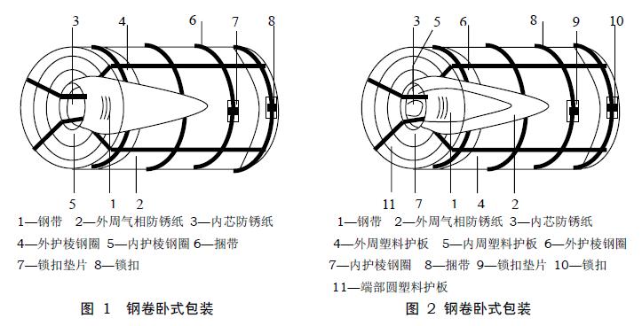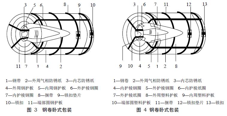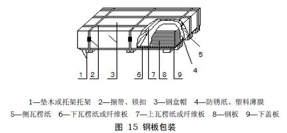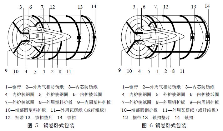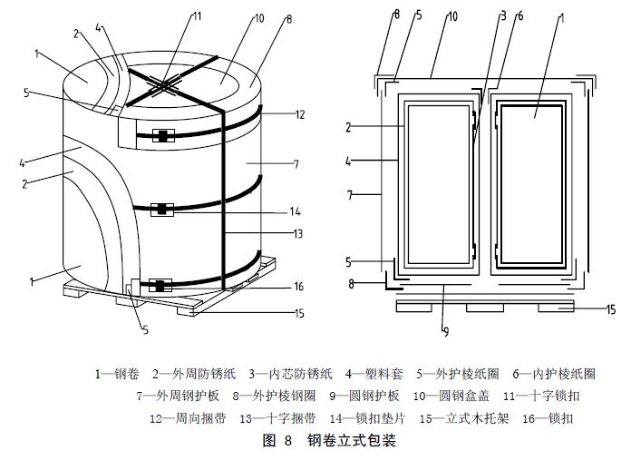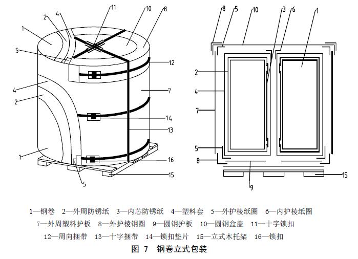 端部加内、外护棱纸圈; 4. 内、外圈分别用内周钢护板和外周钢护板封闭包装; 5.