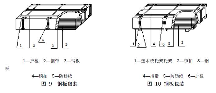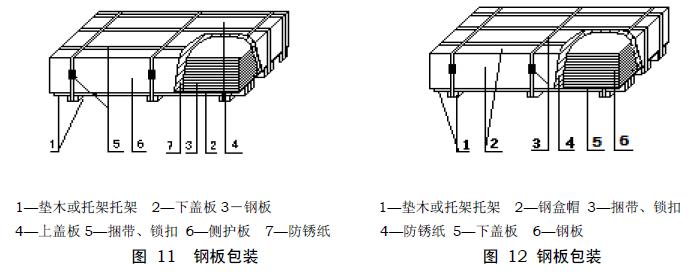 用上盖板、下盖板和侧护板包裹; 3. 捆扎道次:至少纵向3道、横向3道; 4. 用垫木或托架。 |
