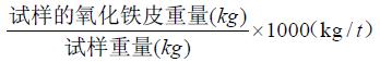 氧化铁皮检验方法 取一盘至数盘盘条试样称其重量,去除表面氧化铁皮再称其重量,前后重量差为试样的氧化铁皮重量。每吨盘条的氧化铁皮重量的计算公式为: