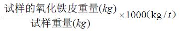 氧化铁皮检验方法 取一盘至数盘盘条试样称其重量,去除表面氧化铁皮再称其重量,前后重量差为试样的氧化 铁皮重量。每吨盘条的氧化铁皮重量的计算公式为:
