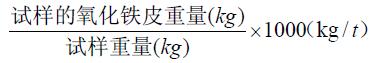 氧化铁皮检验方法 取一盘至数盘盘条试样称其重量,去除表面氧化铁皮再称其重量,前后重量差为试样的氧化 铁皮重量。每吨盘条的氧化铁皮重量的计算公式为: