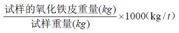 氧化铁皮检验方法 取一盘至数盘盘条试样称其重量,去除表面氧化铁皮再称其重量,前后重量差为试样的氧化 铁皮重量。每吨盘条的氧化铁皮重量的计算公式为: