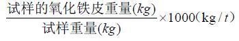 氧化铁皮检验方法 取一盘至数盘盘条试样称其重量,去除表面氧化铁皮再称其重量,前后重量差为试样的氧 化铁皮重量。每吨盘条的氧化铁皮重量的计算公式为: