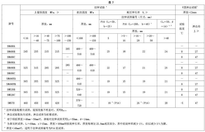 钢板的力学和工艺性能应符合相应表7的规定。 5.2.2