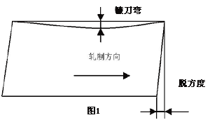 脱方度为钢板的宽边向轧制方向边部的垂直投影长度,或者为钢板对角线之差的一半。如图1所示。 8.3 镰刀弯