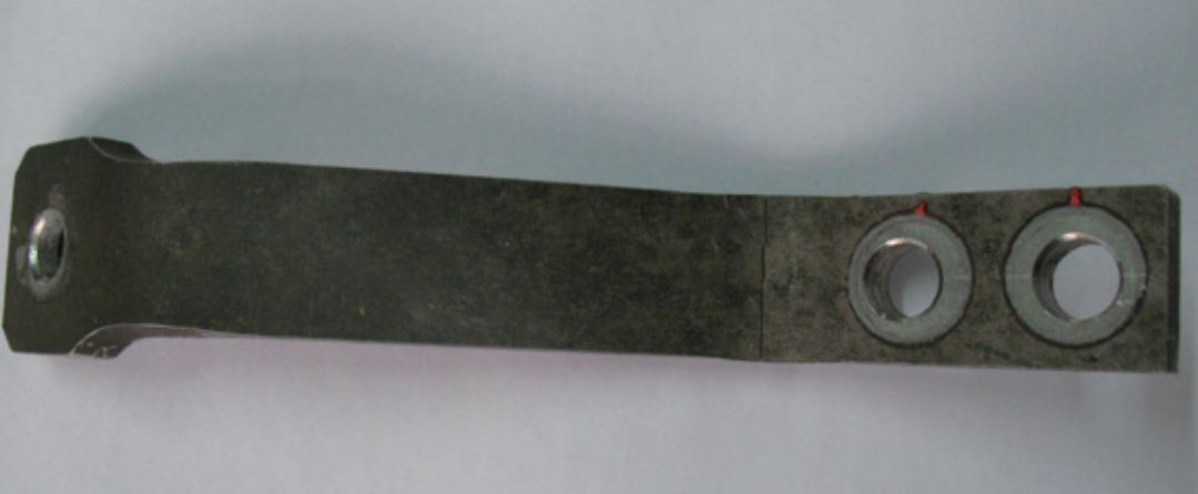 某动车组在检修时发现某车3轴侧高度阀支架有开裂裂纹,当前运行公里数为3650504km,高级修后运行公里数为697447km;此支架的材质为06Cr19Ni10,板材厚度10mm,执行GB/T 4237标准。(1)现场取回高度阀支架的实物平面、侧面形貌如图1所示,实测支架两端平行部分的高度尺寸比图样设计规定的尺寸小约5mm。