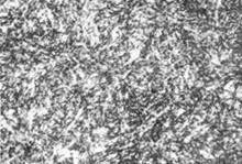 ②回火屈氏体。是中温回火(350—500℃)组织。回火屈氏体是铁素体与粒状渗碳体组成的极细混合物。铁素体基体基本上保持了原马氏体的形态(条状或针状),第二相渗碳体则析出在其中,呈极细颗粒状,用光学显微镜极难分辨(如图3-11所示)。中温回火后有很好的弹性和一定的韧性。