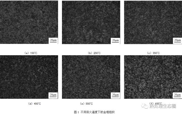 图1不同回火温度下的金相组织。回火是将淬火钢在A1以下温度加热,使其转变为稳定的回火组织,并以适当方式冷却到室温的工艺过程。随着回火温度的升高,马氏体开始发生分解,过饱和的а固溶体中析出弥散的碳化物,金相组织由回火马氏体向回火索氏体转变。当回火温度升高至400℃以上时,已脱离共格关系的渗碳体开始明显地聚集长大,片状渗碳体的长度和宽度比逐渐缩小,最终形成粒状渗碳体。在渗碳体聚集长大的同时,а相的状态也不断发生变化,当回火温度在400℃以上时,由于马氏体的分解、碳化物的转变及聚集球化,使а相的晶格畸变大大减小,因此残留应力基本消除。