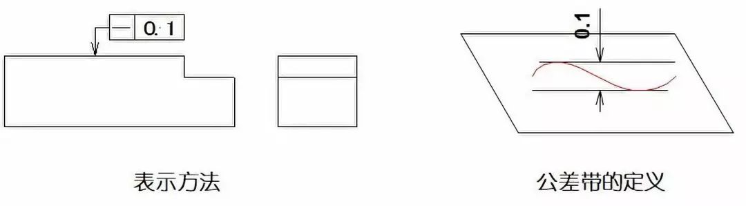 直线度,即通常所说的平直程度,表示零件上的直线要素实际形状保持理想直线的状况。直线度公差是实际线对理想直线所允许的最大变动量。示例1:在给定平面内,公差带必须在距离为0.1mm的两平行直线间的区域。示例2:在公差值前加注记号Φ、则公差带必须在直径0.08mm的圆柱面内的区域。平面度,即通常所说的平整程度,表示零件的平面要素实际形状,保持理想平面的状况。平面度公差是实际表面对理想平面所允许的最大变动量。示例:公差带是位于距离0.08mm的两个平行平面之间的区域。圆度,即通常所说的圆整程度,表示零件上圆的要素实际形状与其中心保持等距的状况。圆度公差是在同一截面上,实际圆对理想圆所允许的最大变动量。示例:公差带必须在同一正截面上,半径差为公差值0.03mm的两个同心圆之间的区域。圆柱度是表示零件上圆柱面外形轮廓上的各点,对其轴线保持等距状况。圆柱度公差是实际圆柱面对理想圆柱面所允许的最大变动量。示例:公差带是半径差为公差值0.1mm的两个同轴圆柱面之间的区域。线轮廓度是表示在零件的给定平面上,任意形状的曲线,保持其理想形状的状况。线轮廓度公差是指非圆曲线的实际轮廓线的允许变动量。示例:公差带是由包络一系列直径为公差0.04mm的圆的两包络线之间的区域。诸圆的圆心位于具有理论正确几何形状的线上。面轮廓度是表示零件上的任意形状的曲面,保持其理想形状的状况。面轮廓度公差是指非圆曲面的实际轮廓线,对理想轮廓面的允许变动量。示例:公差带是由包络一系列直径为0.02mm的球的两条包络线之间,诸球的中心理论上应位于理论正确几何形状的面上。平行度,即通常所说的保持平行的程度,表示零件上被测实际要素相对于基准保持等距离的状况。平行度公差是被测要素的实际方向,与基准相平行的理想方向之间所允许的最大变动量。示例:如公差值前加注记号Φ、则公差带为基准平行直径Φ0.03mm的圆柱面内。垂直度,即通常所说的两要素之间保持正交的程度,表示零件上被测要素相对于基准要素,保持正确的90°夹角状况。垂直度公差是被测要素的实际方向,对于基准相垂直的理想方向之间所允许的最大变动量。示例1:公差带前加注记号Φ,则公差带垂直于基准面直径为0.1mm的圆柱面内。示例2:公差带必须位于距离为0.08mm且垂直于基准线的两平行平面之间。倾斜度是表示零件上两要素相对方向保持任意给定角度的正确状况。倾斜度公差是被测要素的实际方向,对于基准成任意给定角度的理想方向之间所允许的最大变动量。示例1:被测轴线的公差带是距离为公差值0.08mm,且与基准面A成理论角度60°的两平行平面之间的区域。示例2:在公差值前加注记号Φ,则公差带必须位于直径为0.1mm的圆柱面内。该公差带应平行于垂直于基准A的平面B,并与基准A呈理论正确角度60°。位置度是表示零件上的点、线、面等要素,相对其理想位置的准确状况。位置度公差是被测要素的实际位置相对于理想位置所允许的最大变动量。示例:公差带前加注记号SΦ时、公差带是直径0.3mm的球内区域。球公差带的中心点的位置是相对于基准A、B及C的理论正确尺寸。同轴度,即通常所说的共轴程度,表示零件上被测轴线相对于基准轴线,保持在同一直线上的状况。同轴度公差是被测实际轴线相对于基准轴线所允许的变动量。示例:公差值加注记号时,公差带是直径0.08mm的圆柱之间区域。圆形公差带的轴线与基准一致。对称度是表示零件上两对称中心要素保持在同一中心平面内的状态。对称度公差是实际要素的对称中心面(或中心线、轴线)对理想对称平面所允许的变动量。示例:公差带是距离为0.08mm、且相对于基准中心平面或中心线对称配置的两平行平面之间或直线之间的区域。圆跳动是表示零件上的回转表面在限定的测量面内,相对于基准轴线保持固定位置的状况。圆跳动公差是被测实际要素绕基准轴线,无轴向移动地旋转一整圈时,在限定的测量范围内所允许的最大变动量。示例1:公差带是垂直于任一测量平面内,半径差为0.1mm,且圆心在同一基准轴线上的两同心圆之间的区域。示例2:公差带是在与基准同轴的任一半径位置的测量圆柱面上距离为0.1mm的两个圆之间的区域。全跳动是指零件绕基准轴线作连续旋转时,沿整个被测表面上的跳动量。全跳动公差是被测实际要素绕基准轴线连续的旋转,同时指示器沿其理想轮廓相对移动时所允许的最大跳动量。示例1:公差带是距离为半径差0.1mm,且与基准同轴的两圆柱面之间的区域。示例2:公差带是距离为半径差0.1mm,且与基准垂直的两平行平面之间的区域。都看完了,你是不是有小有收获呢?记得收藏并转发哦!