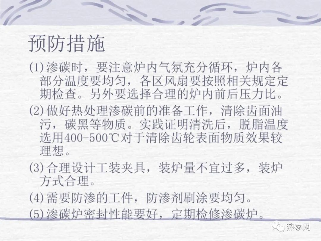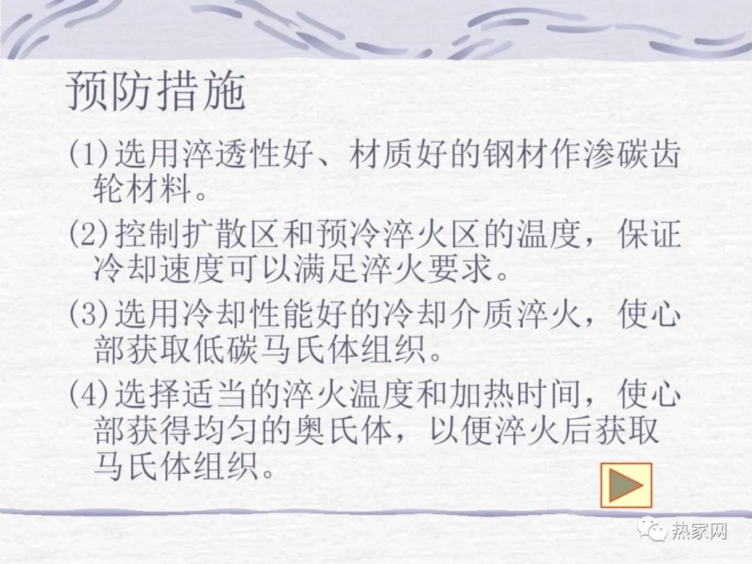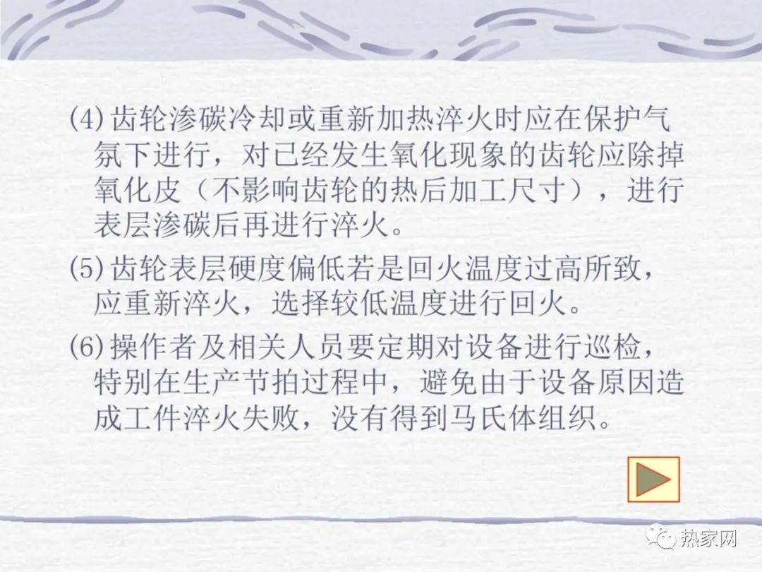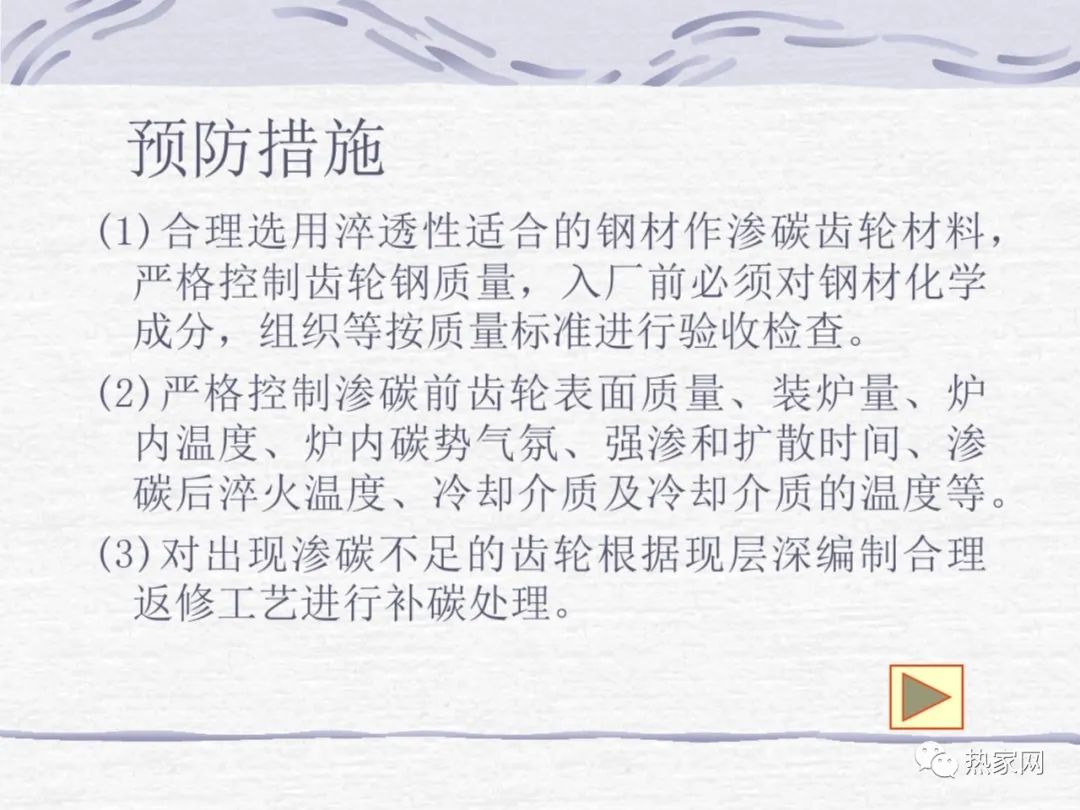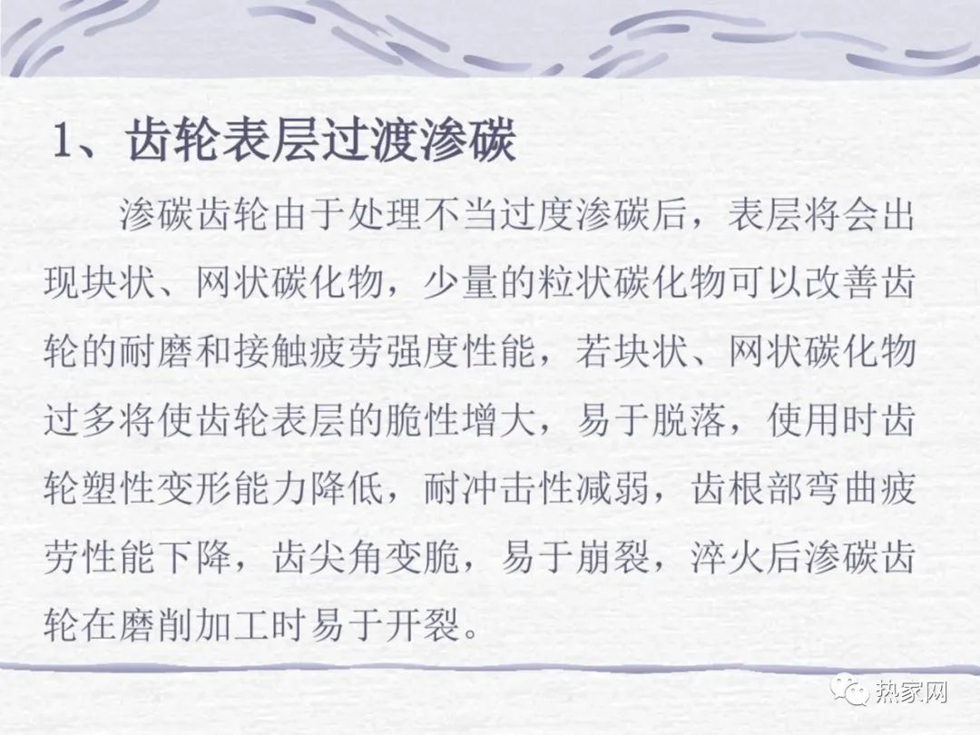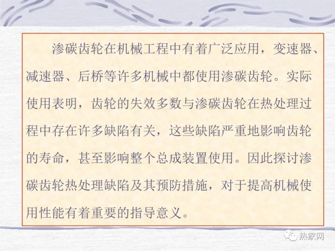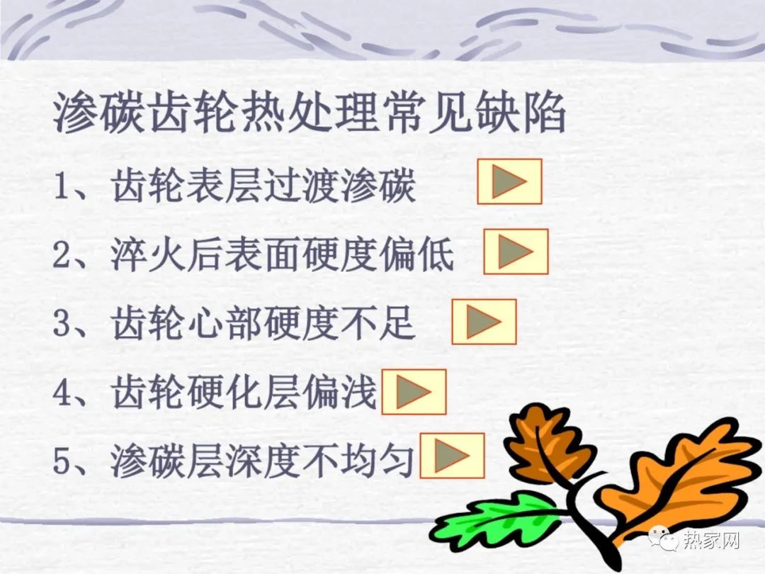 本站之前发表过: 重载齿轮单件渗碳热处理技术-案例分享,浅谈真空渗碳的特性和设备及渗碳后的几种热处理方法,常用Cr-Ni系渗碳钢齿轮的热处理工艺,渗碳后的6种热处理方式,淬火、回火缺陷与预防,有了这些不用找专家了,如何确定渗碳、碳氮共渗热处理工艺过程中的排气时间?,等文章,受到了广大粉丝的好评,所以今天 再给大家分享:渗碳齿轮热处理常见缺陷及预防措施 一组PPT,非常的实用,应该收藏。关键词:热处理,热处理技术,淬火,退火,金相组织,晶体结构,正火,回火,齿轮热处理。