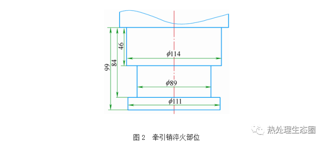 某产品牵引销(淬火部位见图2)为产品中的关键零部件,材料为40Cr合金结构钢,要求f 89mm外圆表面高频淬火,淬火硬度要求50~60HRC,淬硬层深度2.5~4.5mm。该工件需淬火表面尺寸较大,除需要较大的功率进行加热外,对于加热影响更大的问题是淬火部位为工件凹槽部,感应器的制作也是一大困难。如按常规方法制作感应器,即感应器内径稍大于需淬火表面直径,则感应器必须现场制作,十分麻烦,而且工件淬火必须损坏感应器才能进行,每一工件的高频表面淬火必须制作相应的一件感应器,也存在着每一感应器的制作误差;如感应器内径大于相邻截面直径,即大于111mm,则感应器与淬火部位的间距加大了11mm,感应加热效率将显著降低。淬硬层方面,2.5~4.5mm的深度范围是正常热透入深度的2.5~4.5倍,为提高淬硬层深度,一般可适当利用热传导的原理,即利用热量由表面向心部传导的特性,加大加热层的厚度。但单纯依靠热传导的方法需要自表面向内存在较大的温度差,往往要求的淬硬层深度达到淬火温度时,表面温度已过高,产生表面组织过热、过烧等缺陷。