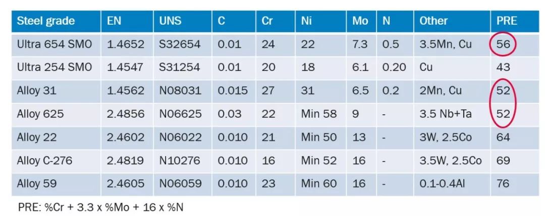 根据下表合金的抗点蚀当量-PRE值,Ultra 654SMO的耐腐蚀性能是要优于Alloy 31和Alloy 625。