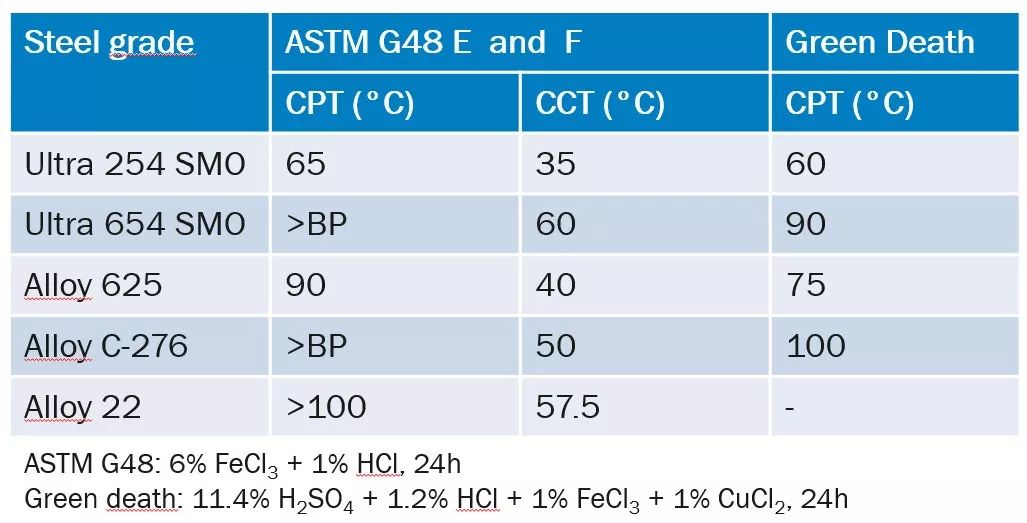 通过ASTM G48的测试,Ultra 654SMO的临界点腐蚀温度(CPT)和缝隙腐蚀温度(CCT),跟镍基合金Alloy C276和Alloy 22相当。