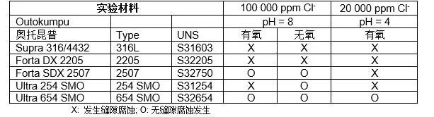 海水中的氯离子含量通常在20 000ppm和30 000ppm之间。但卤盐水中的氯离子含量可能会更高,常常会接近饱和状态。较高的氯离子含量在海水中有杀菌的作用,可以防止生物膜的形成。所以常常被用于海水系统中。但另一方面,过高的氯离子含量也会增加不锈钢腐蚀的危险。卤盐水环境中的腐蚀与氯离子含量、温度、pH值和含氧度有关。在高盐环境中已经进行了许多不锈钢的腐蚀试验研究工作,超级奥氏体不锈钢需要用更高的氯离子含量和温度来检验其耐腐蚀能力。本文的工作包含一系列在90℃的NaCl 溶液中进行的长时间 (> 1300小时) 腐蚀试验。由于缝隙腐蚀是不锈钢最苛刻的一种腐蚀现象,所以通过改变氯离子含量、pH值和含氧度等变量,来观察它们对缝隙腐蚀的影响。有关主要结果在表五中给出。 当氯离子含量和pH (pH = 8, 100 000 ppm Cl-)保持不变时,有氧环境要比无氧环境苛刻的多,甚至造成了6Mo超级奥氏体不锈钢的缝隙腐蚀。由于较高的氯离子含量,普通不锈钢,316L和2205,在两个环境中均发生了腐蚀,而第二代超级奥氏体不锈钢(Ultra 654 SMO) 在包括有氧条件的所有环境中均无腐蚀发生。 尽管氯离子含量降低至20 000 ppm,除了Ultra 654 SMO以外的所有钢种还是发生了缝隙腐蚀,见表五。这个结果清楚地说明了pH值和含氧度的作用,同时也显示了Ultra 654 SMO优越的耐腐蚀性。实际工况中,常常会有类似的、氯离子含量不是特别高但造成不锈钢腐蚀的环境。 表五 在NaCl 溶液中进行的缝隙腐蚀实验; 90℃