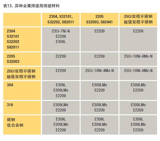 表15归纳了双相不锈钢与异种金属焊接时的常用填充金属。这些例子给出了AWS焊条牌号(E),但是根据焊接工艺,接头形状和其他条件的不同,可采用焊丝(AWS牌号ER)和药芯焊丝。