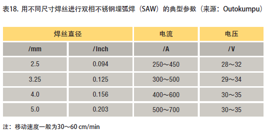 通常的双相不锈钢匹配填充金属适用于SAW。然而正确选择焊剂以获得所期望的性能很重要。据报道,采用高碱度焊剂,双相不锈钢的冲击韧性最好。