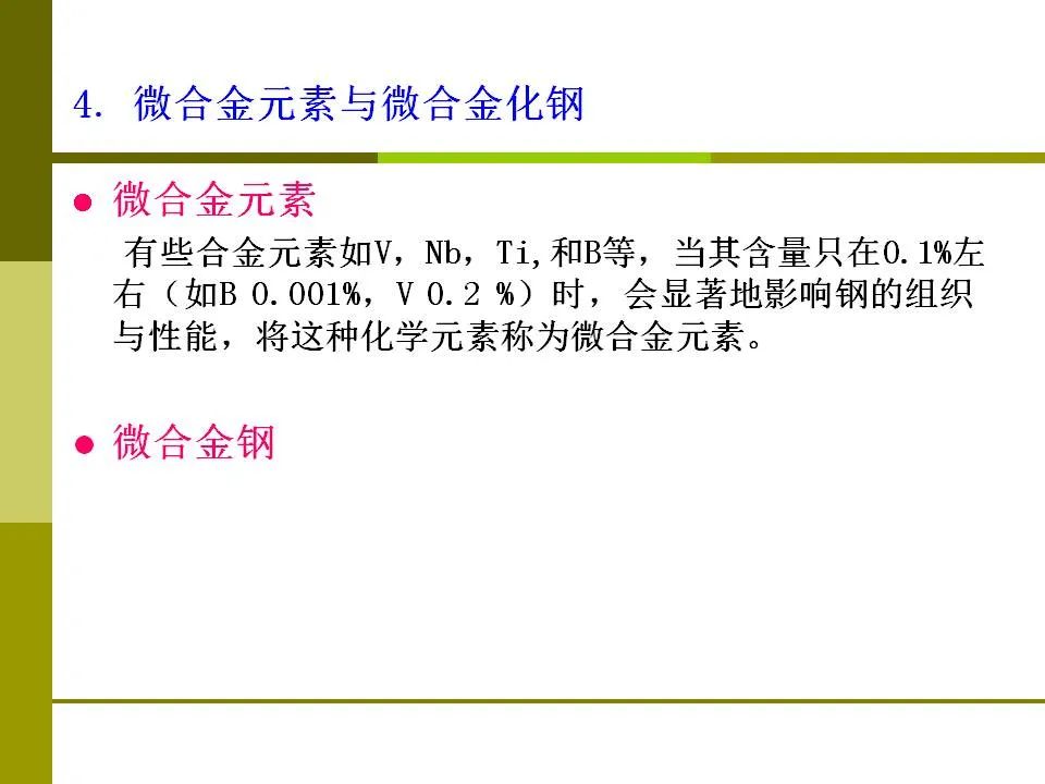 通过加入元素, 使钢材的金属成为(在一定的工艺条件下) 具有预期性能的合金。为保证钢的各种物理、化学性能,向钢中加入合金添加剂将其成分调整到规定范围的操作。那些在普通钢中没有的或含量较少的元素(C、Si、Mn、S或P)都属于合金元素。合金添加剂既可以是纯的材料(镍、铜、铝、石墨粉等),也可以是铁合金(锰铁、硅铁、钒铁、铬铁等),也可是合金元素的化合物(氧化物、碳化物、氮化物等)。在炼钢生产中,一般脱氧与合金化几乎同时进行,有时不可能把脱氧元素与合金元素截然分开。但脱氧与合金化二者的目的和物理化学反应过程是不同的。