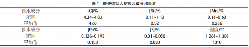 目前我国转炉炼钢生产对于操作人员所具备的生产操作经验依赖较大,受操作人员思维惯性以及反应能力有限等一系列因素制约,转炉炼钢生产效率和污染物排放控制有待进一步改进。在采用渣料减量化冶炼、石灰石复合造渣、铁矿石熔融还原以及留碳作业后,进一步增加了生产人员依靠经验进行操作的难度,因此需要建立一种充分考虑各种工艺参数和原材料状况,解析炼钢过程控制要素的智能化炼钢控制模型,以摆脱操作人员思维限制,降低炼钢过程中的渣量、气体和粉尘排放,实现智能化、环境友好型炼钢。原料条件及参数选取与确定