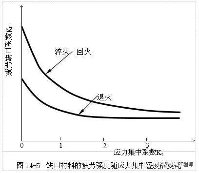 对于光滑材料,通过表面淬火、表面渗碳、表面氮化等表面热处理可以有效地提高其疲劳强度。但是对于缺口材料,这些方法可能变的没有效果甚至使疲劳强度反而降低。这是因为通过热处理使其表面强度提高的同时,使缺口敏感性也变高的缘故。图14-5为高强度钢和塑性较好的低强度钢的缺口材料的疲劳强度随应力集中程度的增加而变化的情况。在应力集中Kt较小的范围内,高强度钢的疲劳强度明显比低强度钢的高。但随着应力集中系数的增加,高强度钢的疲劳强度的降低速度明显大于低强度钢者,以致于高强度钢的疲劳强度与低强度钢的疲劳强度相差无几。