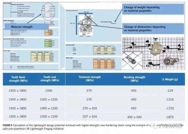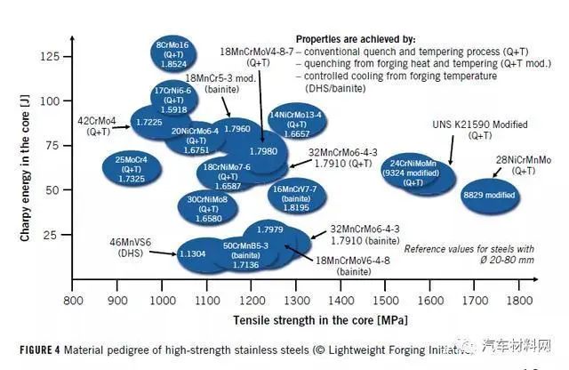 锻造和轻量化当人们想到锻造时,轻量化并不是一个立刻浮现在脑海中的词。然而,锻造技术被证明是一种经济有效的方法,可以在汽车应用中实现轻量化的设计进步,从而适合大批量生产。通过利用锻造技术提供的潜力。在当前的“轻型锻造计划”研究项目中展示了在双桥(splitaxle,分段式驱动桥)混合动力汽车(HybridElectric Vehicle,HEV)和重型卡车子系统中轻量化设计的潜力。项目和评估车辆(图1显示了项目详细信息和技术车辆数据:研究项目共提出了733个混合动力汽车轻量化设计构思和251个卡车轻量化构思。)图1轻量化设计潜力概述混合动力汽车:作为研究的一部分,考虑了混合动力汽车中总重量为816千克的零部件–大约相当于参考汽车的51%。分析了来自混合动力汽车的动力总成、底盘和电子设备的3600多个comCOVER组件,总共开发了733种轻量化设计思想。然后根据轻量级设计潜力、制造工作和市场实施工作的标准对这些想法进行权衡和分类。这样就可以根据轻量化设计的成本效益比来评估相关的设计想法,如图2所示。总的来说,该研究确定了混合动力汽车93千克的轻量化设计潜力,这相当于所分析部件质量的大约11%。然后,根据潜在的重量节省和实施努力,这些想法可以被分类为速效方案、平衡和较难实施的三类,具体取决于潜在的重量减轻和实施工作。图2商用车:对于商用车动力总成而言,在设计基准测试期间共分析了460个组件,总重量为909kg。在该总重量中,290千克来自传动装置,而619千克来自传动轴和后轴。基于技术可能性,开发了250多个轻型设计思想。最终的轻量化设计潜力总计达到124千克,大约是所分析组件质量的14%。这些想法可以归类为通过材料、设计或生产概念实现的轻量化设计。但是,这些概念并不是完全独立的,有时它们是相互依赖的图3采用材料创新的轻量化设计现代的高强度钢可以为减轻单个零件的重量,从而减轻车辆的总重量做出重要且具有成本效益的贡献。倡议的钢铁制造商和锻造公司提议使用大约20种不同的高强度钢,以实现轻量化,更精简的零部件设计。这些钢具有广泛的成分,金相组织和性能范围。建议的一些沉淀硬化铁素体-珠光体(弥散硬化钢,DHS)和调质(Q+ T)高强度钢,以及在锻件冷却后具有贝氏体组织的钢在图4的材料谱中显示了这些材料的锻造温度、以及它们的强度和延展性。图4Saarstahl,Sidenor和Georgsmarien-hütte建议连杆,曲轴和轮架使用高强度弥散硬化钢,例如38MnVS6和46MnVS6,它们通过锻造热的冷却控制而达到机械性能,而无需额外的热处理工艺。在某些情况下,这种弥散硬化钢的强度可能会超过传统的调质钢的强度,例如42CrMo4。图5高强度贝氏体钢有时会通过锻造热的受控冷却获得更高的强度,同时改善延展性。图4显示了几种贝氏体钢。在图5提出了几种用于具体应用的贝氏体。图5中的百分比表示与轻量化设计方案相比,系列零件的重量增加了多少。铁姆肯钢公司(TimkenSteel)展示了具有较高强度的冲击性能(夏比能量值)的钢。在如此高的强度下,钢的清洁度起着至关重要的作用。铁姆肯钢铁公司表示,因此在生产过程中使用了其“超洁净铀”技术。弹簧钢可实现最高的抗拉强度,例如55Cr3,Saarstahl建议的热机械轧制54SiCrV6、60SiCrV7或ArcelorMittal展示的SolamM2050 S-Cor,强度可达2050MPa。这种钢可以减轻诸如横杆或弹簧之类的车辆部件的重量。通过使用高强度钢实现的重量减轻不仅在锻件的情况下是可能的。使用可以承受更高载荷的锻钢也可以替代铸件。因此,德国DeutscheEdelstahlwerke建议使用不锈钢,耐磨、高碳浓缩和氮合金钢来代替重35.5千克的铸造卡车制动盘。在此应用中,Sidenor在使用耐磨的锰合金钢1.3401(X120Mn12)时发现了轻量化的设计潜力。在图5(左上方)中,介绍了在分析的混合动力SUV中应用的差速器输入轴的轻量化设计潜力。该空心轴目前由一种称为SCr420H的CrMn渗碳钢制成,重量为1182g。作为此类CrMn渗碳钢的高强度替代品,Georgsmarienhütte与Hirschvogel合作开发了一种微合金化贝氏体钢,称为16MnCrV7-7(1.8195)。该钢还可以进行表面硬化处理,并在高达1050°C的渗碳温度下保持稳定的细晶粒结构。其特征还在于更高的淬透性值。这种用于差速器输入轴的高强度钢可实现优化的薄壁设计,从而有望减轻307g的重量。在该计划中进行的分析还表明,对于管件(例如在减震器中组装的管件),可以实现可观的重量减轻。因此,本特勒建议用屈服强度为500-600兆帕的高强度铁素体-贝氏体多相钢FB590替换屈服强度至少为235MPa的E235+ CR钢制成的管件。这样,外管的壁厚可以从2.8毫米减小到2.0毫米,从而实现250g的相应轻量化减重(图5左下)。安赛乐米塔尔(ArcelorMittal)建议使用铁素体-珍珠岩钢或其贝氏体钢SolamB1100作为铸造材料的轻质替代品,例如用于转向节。通过在零件上进行的有限元模拟,可以估算出所减轻的重量。通过使用贝氏体锻钢,可以实现4100克重量的铸件替换原先的5060克铸件——只需通过锻造热控制冷却,而无需进行昂贵的热处理工艺。钢铁制造商Sidenor建议使用其Micro1100钢(44MnSiVS6)来减轻图5(右上方)所示转向节的重量。通过直接从锻造热中冷却钢,生成了铁素体-珠光体晶粒组织,其抗张强度为1100MPa。Sidenor认为这种轻量化设计潜力约为20%。连杆的轻型设计建议由ArcelorMittal,DeutscheEdelstahlwerke,Georgsmarienhütte,NipponSteel,Nis-san,Saarstahl,SchmiedetechnikPletten-be