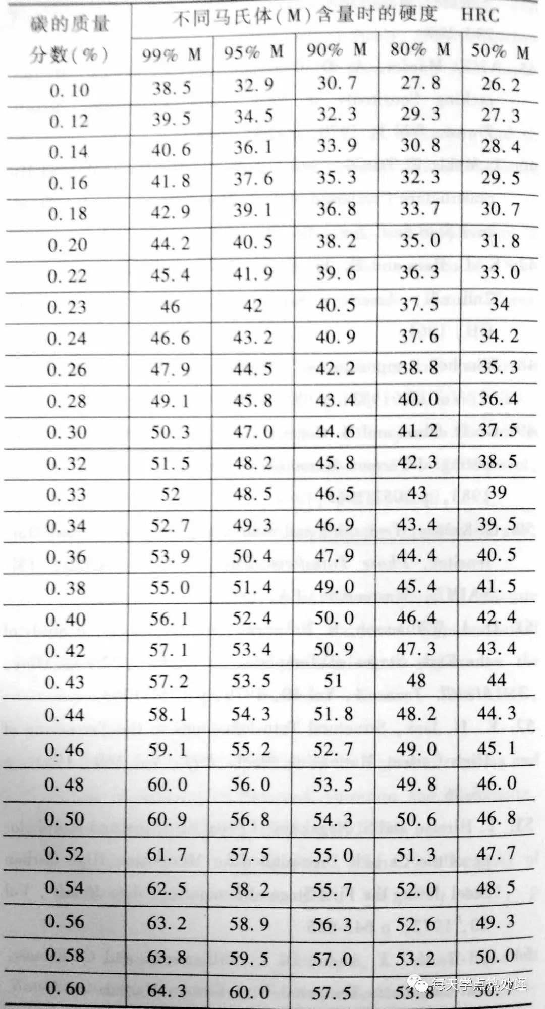 从 美国金属学会 热处理手册 上学习:钢的硬度和淬透性 (上,中,下)列表: