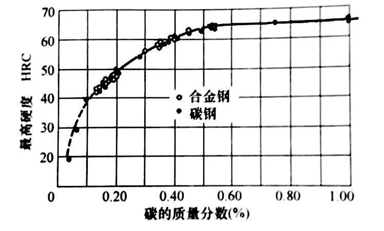 对于一个给定的含碳量,当为100%马氏体组织时,可达到最大硬度,这种组织只能从表面或小型钢试样的薄截面上获得。大截面上无法达到足够大的冷却速度,从而无法完成100%马氏体转变,因此零件的马氏体层深度和硬度会降低。