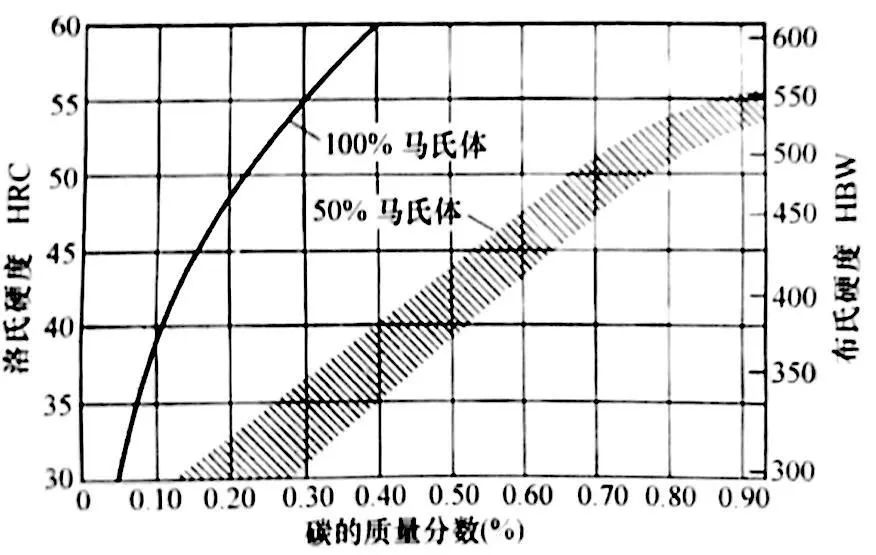 淬透性是衡量淬火能力的一种以试验为依据的指标,不应该将其与硬度或淬火后马氏体的最高硬度相混淆。硬度取决于含碳量和马氏体转变程度,钢中不同的含碳量与马氏体含量对硬度的影响见图1 和 表1 。