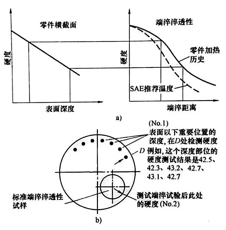 由此产生了三个位置的硬度数值,例如,SACNo. 63-52-42表示表面硬度为63HRC, 区域硬度为52HRC、心部硬度为42HRC.在SAE J406标准中有详细的试验方法。