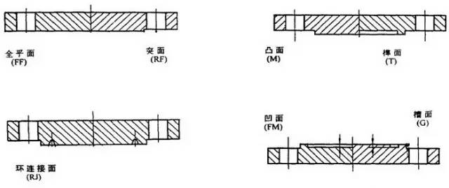平面(FF)、突面(RF)、凹凸面(MFM)、榫槽面(TG)、环连接面(RJ)