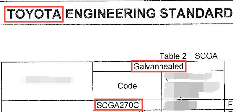 SCGA270C:丰田汽车的车厂牌号,新铁合金镀层,英文Galvannealed。