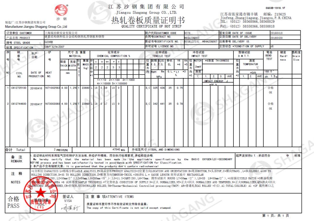 舞阳钢铁有限责任公 产品质量保证书验证 (质保书-质量证明书-查询验证网站)