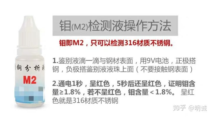 通电型,如:钼(Mo)检测液,主要用来检测316不锈钢(钼是贵金属其它不锈钢不含钼,主要针对有些不法商家用304冒充316)