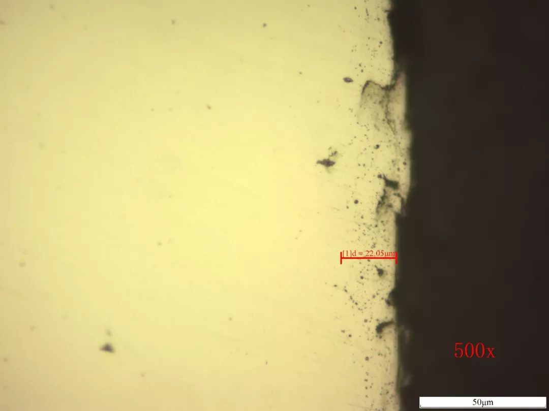 根据试样试验的效果,我们将工件在925℃碳势Cp=0.65%气氛中,在氮气保护下扩散,中间每隔一段时间从试样孔取样检查,跟踪碳化物变化情况,直到20h时,检验试样发现碳化物完全消除。将工件降温、淬火、回火,检验发现碳化物完全消除,合格。如图3a所示。有效硬化层深度3.219mm,合格,如表2所示。表面氧化层深度22.05um,合格,如图3b所示。