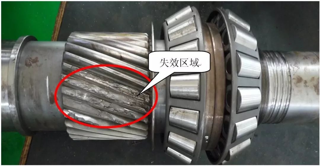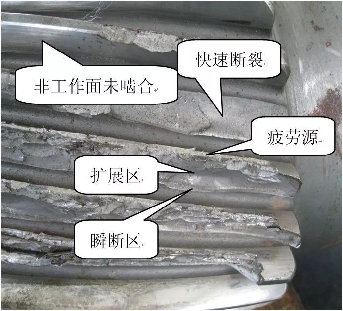 偏载原因之一为设计加工或安装不合理,安装精度低,同轴度差;原因之二为齿廓修形偏正,节线以上区域凸起,致使齿轮轴跑合期仅节线以上区域参与啮合,齿顶磨损量加大,结合硬化层偏浅不利因素,浅层剥落裂纹几率大增。两方面原因致使齿轮轴在受载变形后齿面压力分布不均匀,齿面接触不良,产生偏载和较大的振动,啮入和啮出的冲击力增大,接触应力增大,轮齿啮合时产生的摩擦热越大,结果导致润滑油膜失效,形成点蚀及剥落,最终使轮齿产生疲劳断裂。