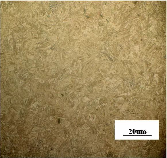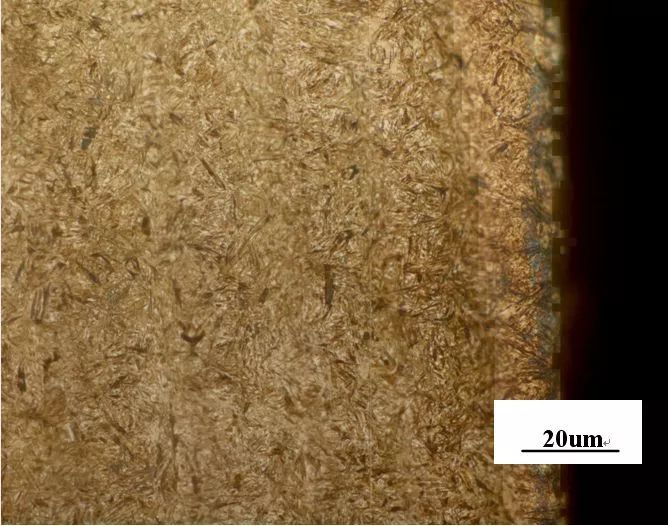 截取断裂齿部,经磨制后,在金相显微镜进行微观组织观察,齿根脱碳层16μm,内氧化IGO为10μm,脱碳层及IGO符合技术要求,不存在齿根表面因脱碳而产生拉应力引起疲劳断裂的可能。断口区域齿面显微组织见图4,芯部组织见图5,可见齿面表面马氏体针为10μm左右,无可见碳化物,残奥为20%左右,芯部组织为马氏体加少量下贝氏体,芯部硬度36~38HRC,组织符合ISO6336-5《直齿和斜齿齿轮承载能力计算—第5部分材料强度》ME级要求,失效非热处理组织问题导致。
