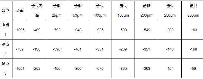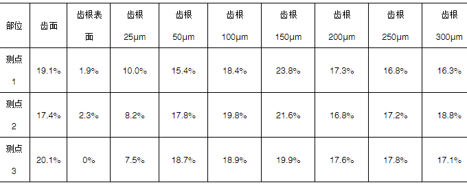 对断裂齿的齿面及齿根进行X射线衍射法残留应力(见表3)及残留奥氏体检测(见表4),断裂齿部齿面最大残留压应力-1095 MPa,齿根在100μm处出现最大残留压应力-926MPa。该残留应力符合渗碳淬火齿轮压应力分布特点,残留压应力符合技术要求,断齿非残留应力异常导致。齿根最大残留奥氏体数量23.8%,残留奥氏体数量符合ISO 6336-5《直齿和斜齿齿轮承载能力计算——第5部分材料强度》ME级要求,失效与残留奥氏体无关。