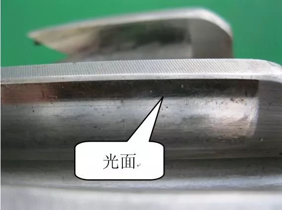 从啮合状况来看,啮合不良,在齿向以及齿高方向上局部未完全参加啮合,局部偏载,载荷分布不均匀。从图7中节线处的磨削流线痕迹可分析出:增速机运行后,该部位一直未参加啮合运动,否则经过一阶段的跑合应产生图8所示的光面效果,说明载荷分布不均非断裂齿部阻扰造成,为原先齿轮副系统设计加工或安装不合理导致。