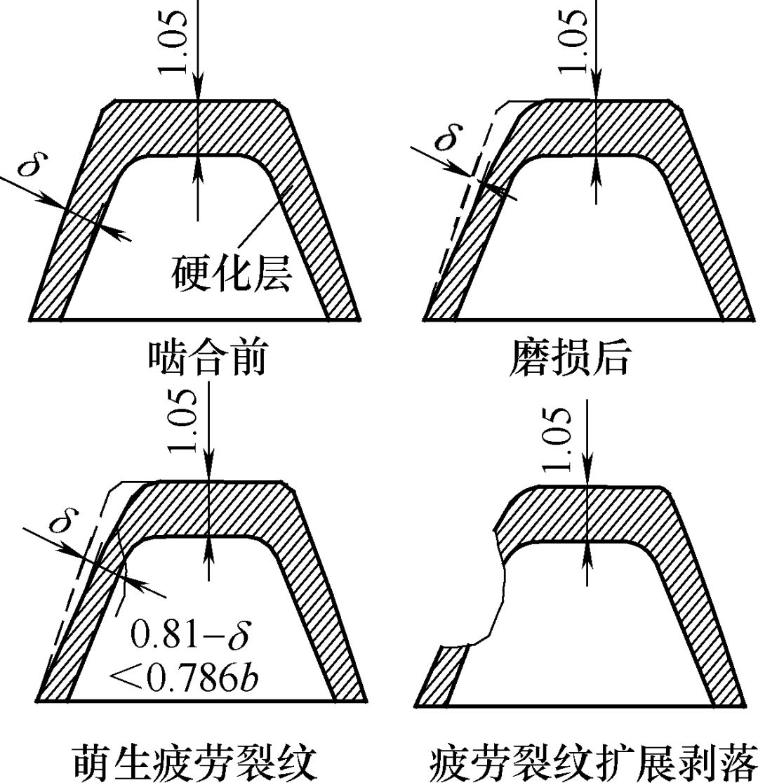 对该齿轮轴进行精度检测,发现其齿顶偏正,同时对配对齿轮精度检测发现其齿顶无偏正或偏负现象,此种齿形将导致啮合时节线以上区域优先进行跑合磨损,产生局部高交变应力接触,随着跑合的进行,齿面的粗糙峰逐渐磨平,实际接触面积增大。此齿轮轴齿面硬化层仅0.81mm,节线以上区域的局部磨损致使节线以上区域硬化层较大幅度降低,在啮合时,局部高接触应力导致最大剪切应力峰所处位置大于磨损后的硬化层深度,将在次表层萌生疲劳裂纹,疲劳裂纹萌生后,裂纹沿着最大剪切应力方向平行齿面扩展,压断后形成剥落型凹坑。图9为齿轮轴齿形示意图;图10为节线以上区域磨损剥落演示图(δ为节线以上区域磨损深度)。