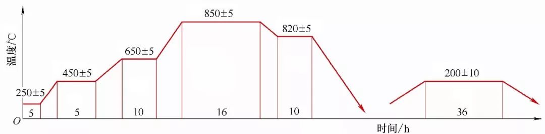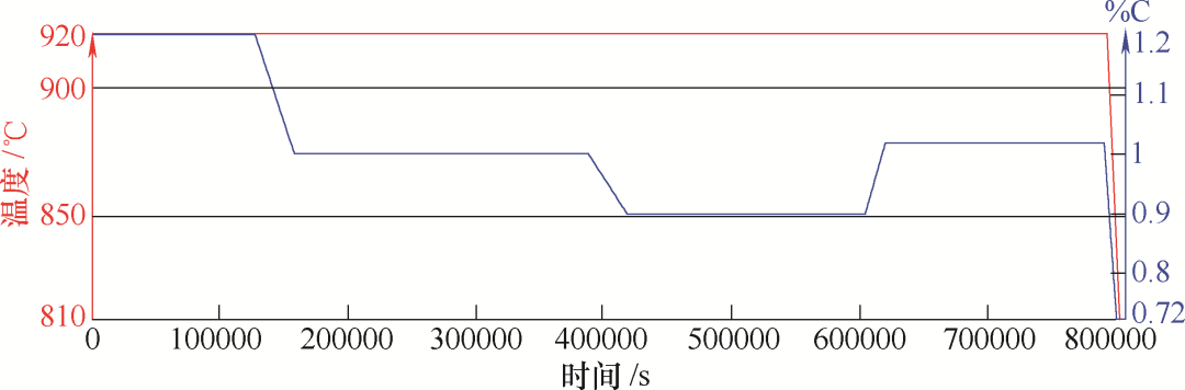 17CrNiMo6属德国牌号,材料成分如附表所示。其渗碳淬火时由于合金元素含量较多,冷速较快时有淬裂的危险,且大型工件表面淬火到如此高的硬度,难度较大。传统渗碳后齿轮轴渗层分布如图2所示。传统渗碳淬火热处理工艺曲线如图3所示。