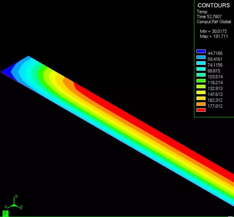 通过SYSWELD模拟齿轮轴淬火过程得到工艺参数有:预冷时间、水冷时间、空冷时间等。水淬前在空气中预冷的时间5min,目的是减少淬裂倾向,空冷时间的控制以不发生珠光体转变为准。预冷后的水冷时间15min,主要控制因素为淬火应力的大小,随着水冷时间的延长,齿根处淬火应力会越来越大,在淬火应力小于材料屈服应力时停止水淬。水冷后的空冷时间10min,目的是使马氏体自回火,减少应力,但回火温度不应过高,控制在低温回火范围内,以免硬度下降太多。