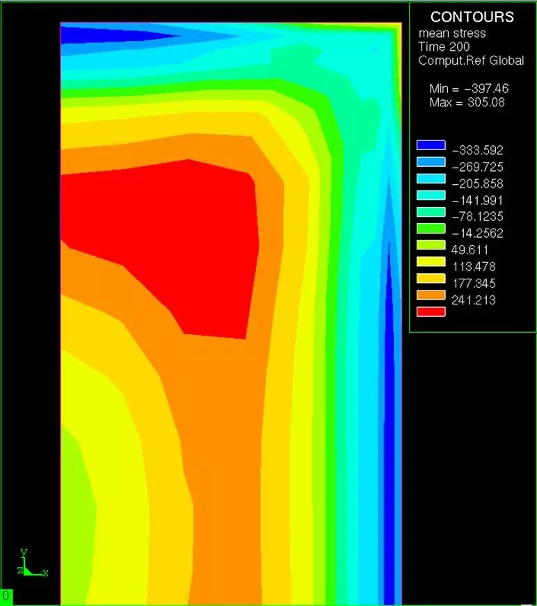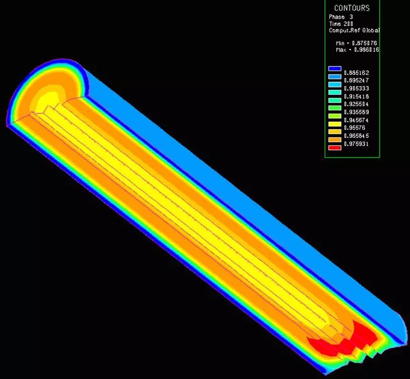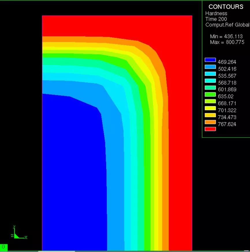 材料、渗碳工艺、淬火温度确定以后,对硬度产生关键影响的,就是冷却方式了。由于油冷的结果显示,硬度远远达不到技术要求。本文采用水冷的方式,但17CrNiMo6合金含量较高,水淬易裂。采用Φ100mm试棒做渗碳后淬火数值模拟,检查17CrNiMo6材料淬裂倾向性,并合理估计计算机模拟的误差范围。