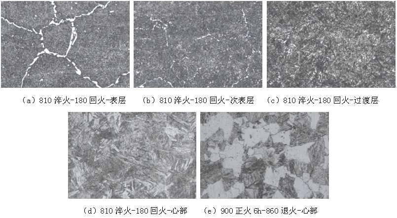 试棒金相组织如图9所示。图9a淬火回火后表层为渗碳体和回火马氏体,由于碳含量较高(0.9%左右)碳化物成网状,故渗碳表面硬且脆,给淬火带来很大的不便。图9b是渗碳过渡层,此处碳含量较表层低,渗碳体并未练成网状,只在晶界处隐约可见。图9c是过渡层,为残余奥氏体基体上的回火马氏体。心部组织图9d则为残留奥氏体基体上的低碳马氏体。