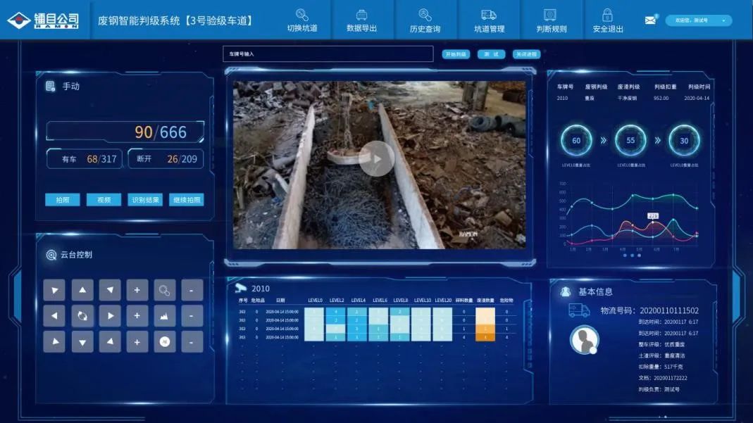 现场各位置布置多块高清可触控显示屏,现场验级人员,废钢供应商等人员可进行实时操作,观察废钢卸车情况,查看系统评级依据,车内各废钢料型的占比情况,油污渣土碎料等扣重信息以及最终评级结果。