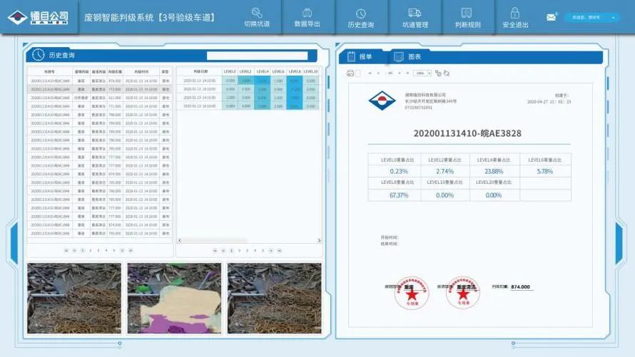 自动形成每车废钢的评级报表并打印。评级报表内容包含:车辆入场时间,车牌信息,合同号,卸车时长,废钢等级(包括各厚度废钢料型的占比),扣重扣杂信息等。