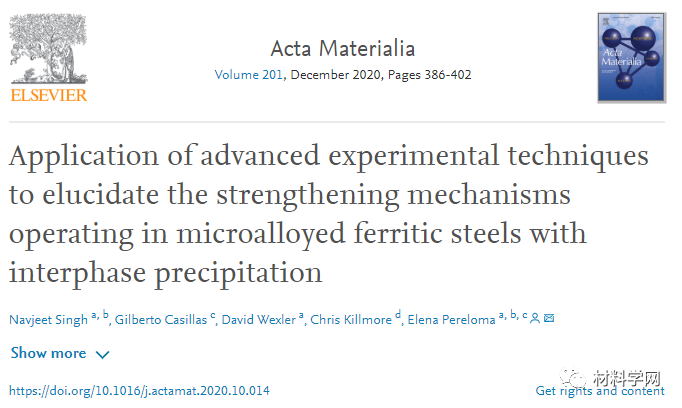 基于此,本文采用Mo、Cr、V、Nb进行微合金化,比较不同合金化组合物的效果。此外,通过利用先进的实验技术(高分辨率扫描透射电子显微镜(HRSTEM)和原子探针断层扫描(APT)),深入了解不同操作机制对强度的贡献。相关研究成果以题“Application of advanced experimental techniques to elucidate the strengthening mechanisms operating in microalloyed ferritic steels with interphase precipitation”发表在金属顶刊Acta materialia上