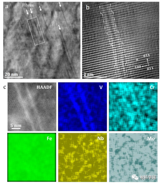 图5 VCrNb钢中的纤维析出:(a)BF-STEM显微照片显示了几个平行纤维。(b)STEM-HAADF显微图基体/纤维颗粒界面台阶显微照片。(c)HAADF-STEM显微图和图(a)中被选中的对应的平行纤维STEN-EDS图谱。空间轴是[011]。